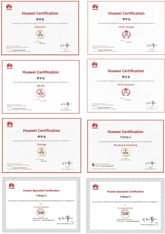 HCIE-Datacom课程-李宇龙,拥有11年项目交付经验,并且持有业界最权威的华为HCIE-Datacom、HCIE存储专家级认证。