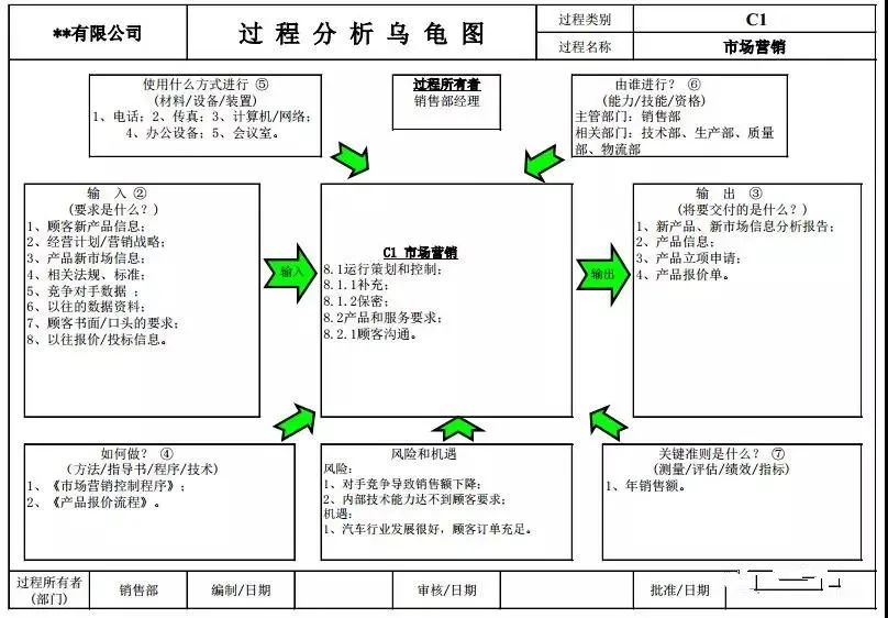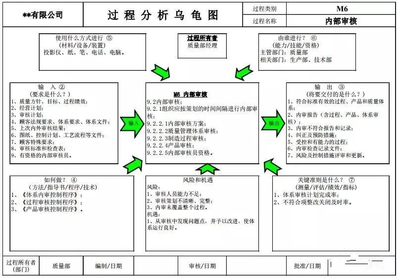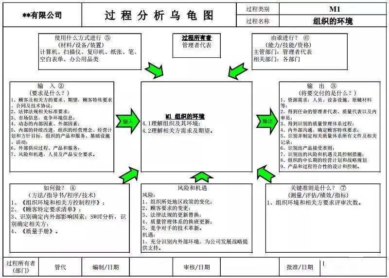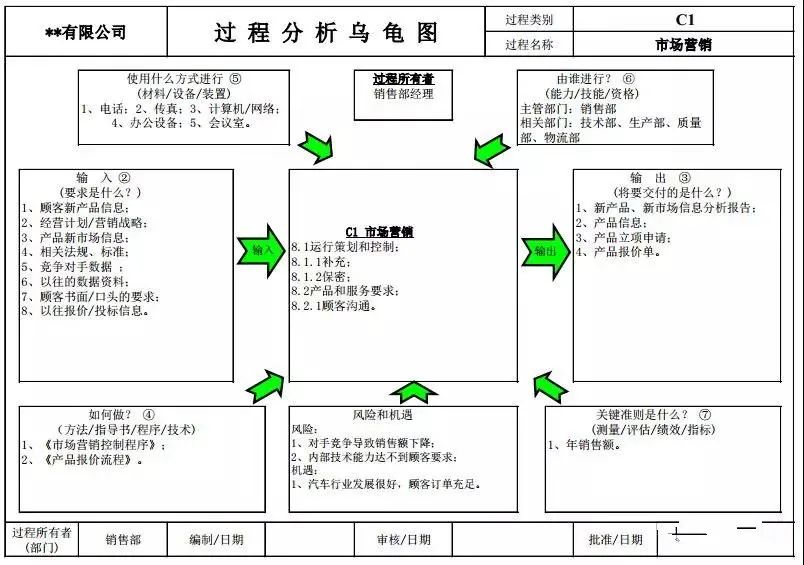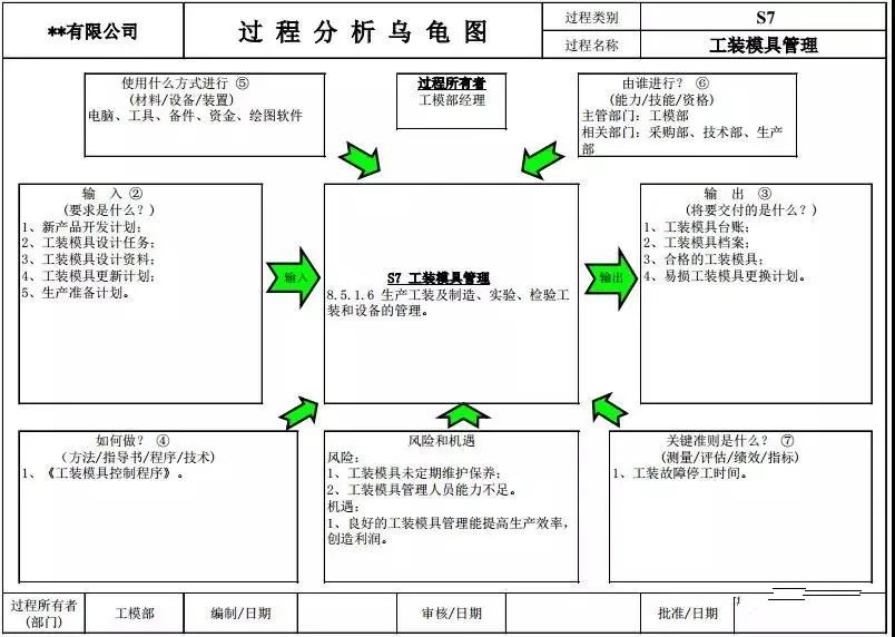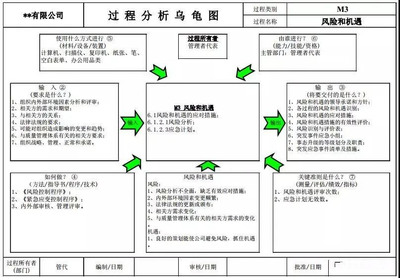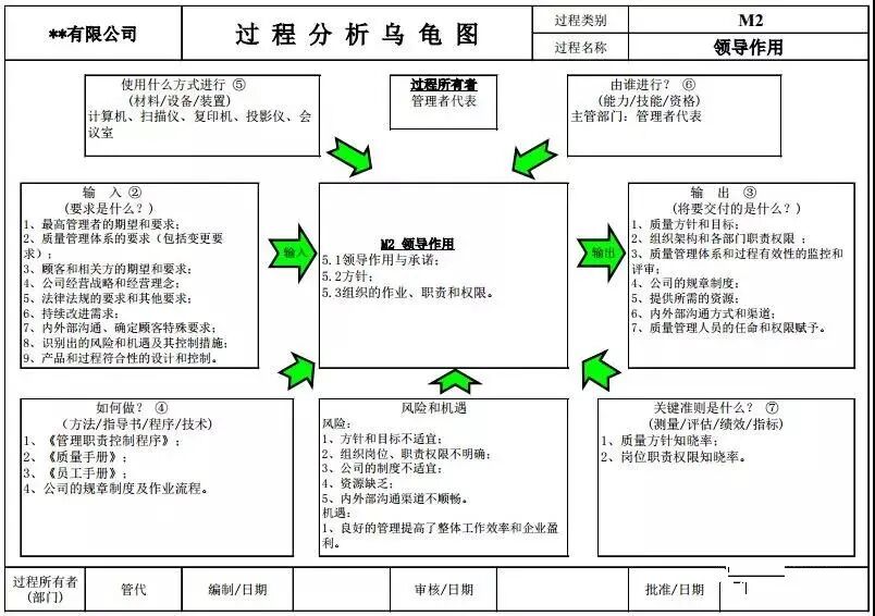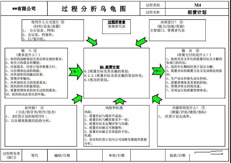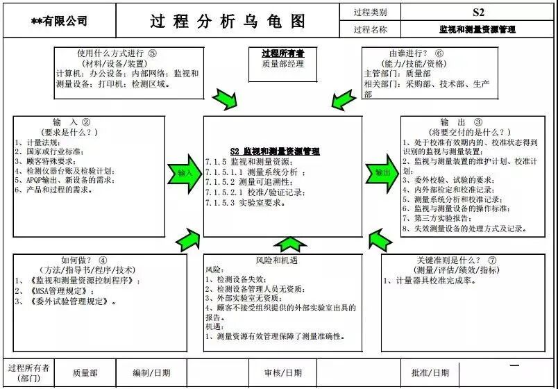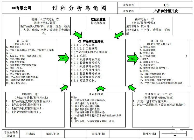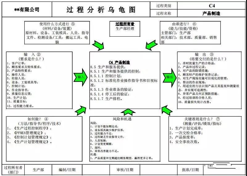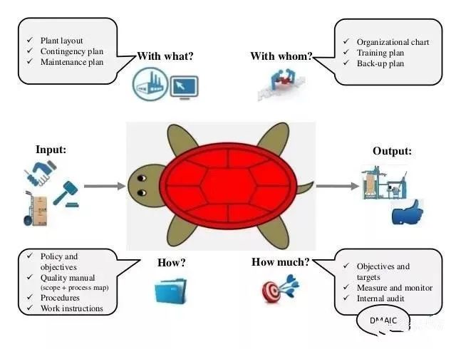 而要建立这些管理文件,公司必须开展系统的过程分析活动,IATF (International Automotive Task Force)国际汽车工作组推荐了一种单一过程分析图,因形似乌龟而称为乌龟图。