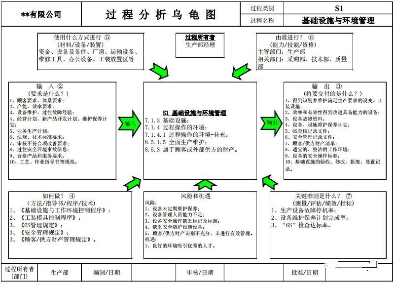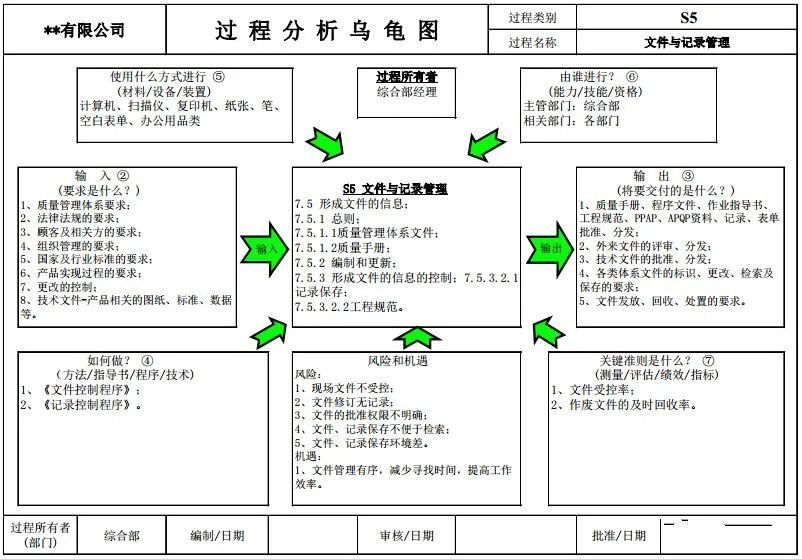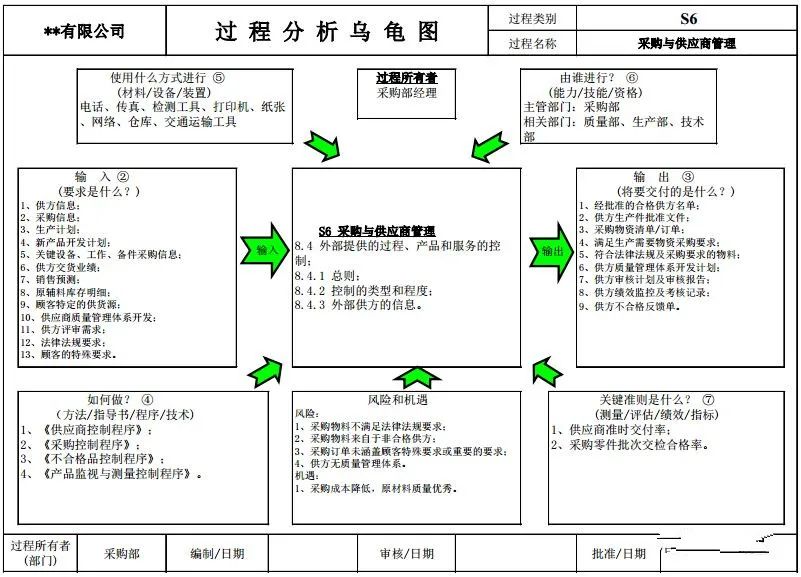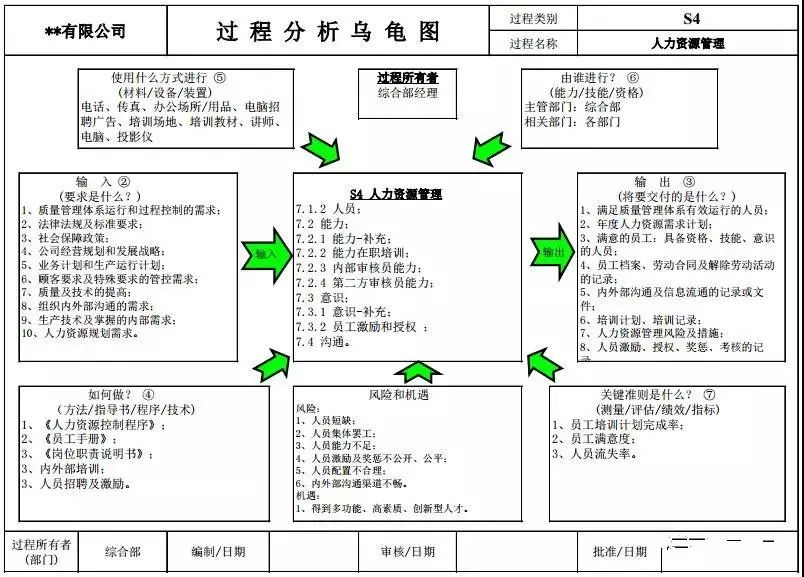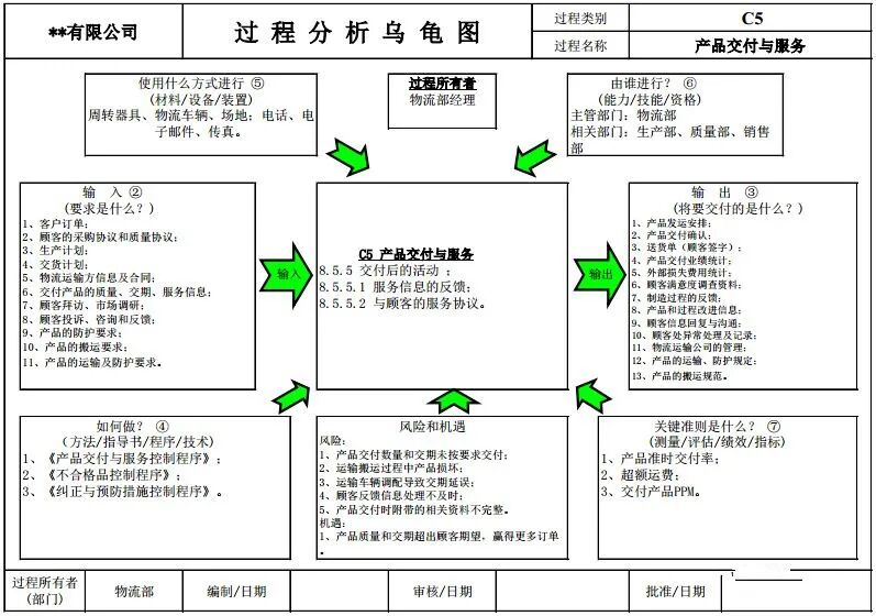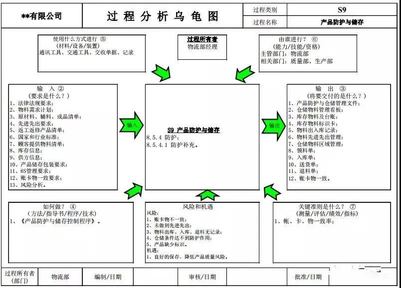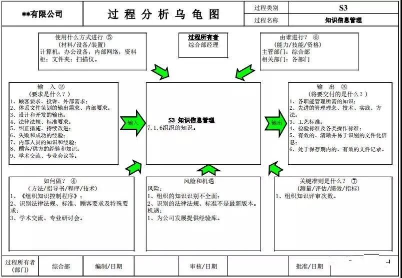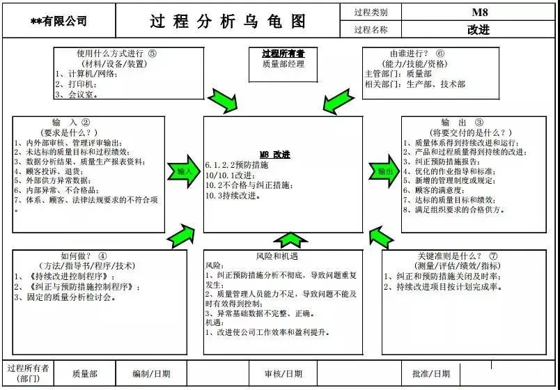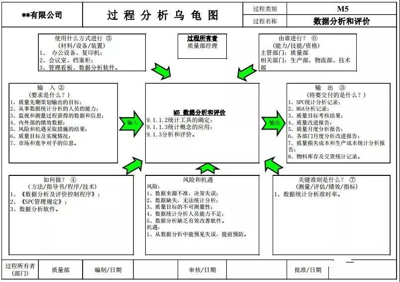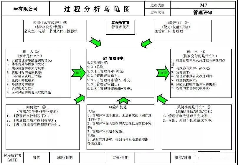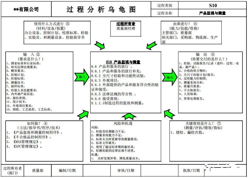 而要建立这些管理文件,公司必须开展系统的过程分析活动,IATF (International Automotive Task Force)国际汽车工作组推荐了一种单一过程分析图,因形似乌龟而称为乌龟图。