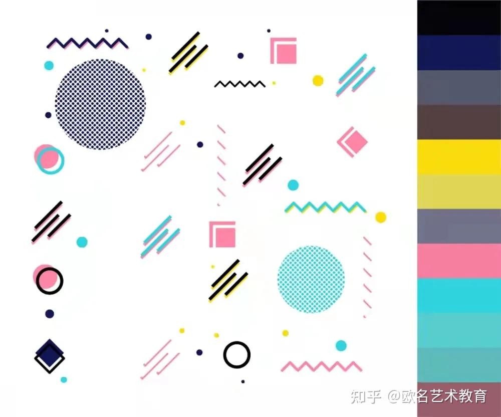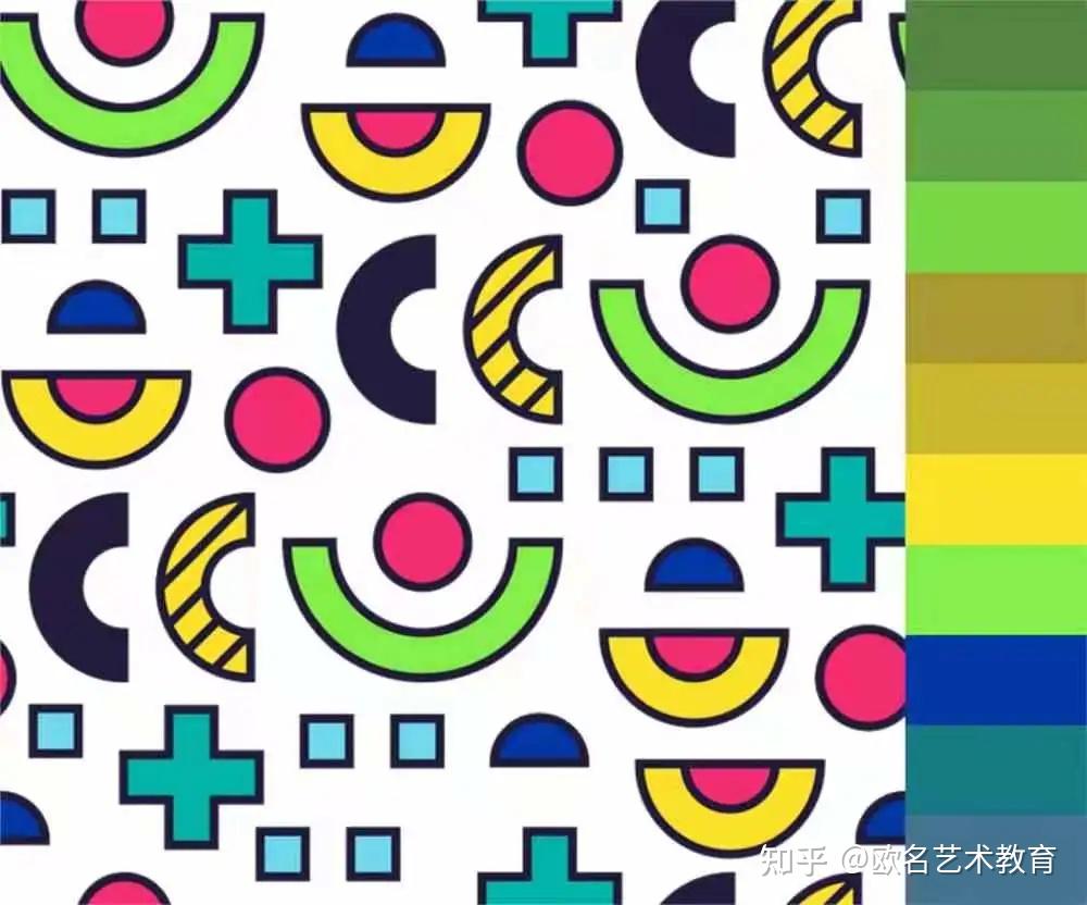 孟菲斯配色在用色上非常大胆,常常故意打破配色规律,使用明快、风趣、彩色明亮的色调。