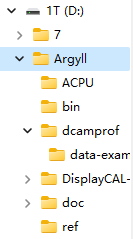 Argyllcms软件解压到D:\Argyll,Dcamprof软件解压到D:\Argyll\dcamprof。后文都是绝对路径,不需要添加环境变量。