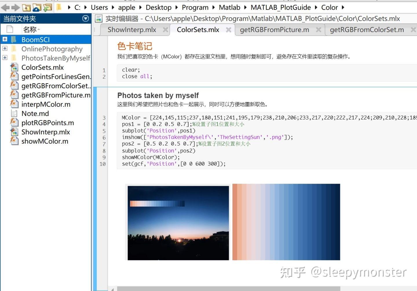 方案的思路是从图片中通过鼠标取点提取一系列RGB三元组为色卡矩阵,然后把色卡矩阵和相应的图片存在MATLAB的实时脚本ColorSets.mlx和其路径下的一些文件夹中如:BoomSCI、OnlinePhotography、PhotosTakenByMyself,如下图所示。每次使用时复制色卡到画图程序中通过特定函数转化成我们画图实际使用的色卡。