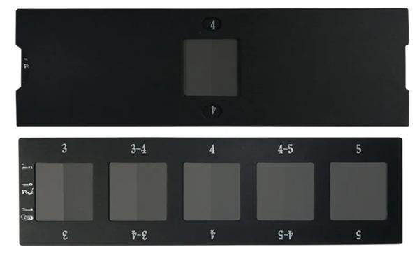 变色用灰色样卡由五对无光的灰色纸片(或布片)组成,下图为根据可辨的色差分为五个牢度等级,即5、4、3、2、1。在两个等级中间再补充半级,即4-5、3-4、2-3、1-2,就扩大成为五级九挡灰卡。每对第一组成均是中性灰色,其中色牢度等级5的第二组成与第一组成相一致,其他各对的第二组成依次变浅,色差逐级增大,各级观感色差均经过色度确定。