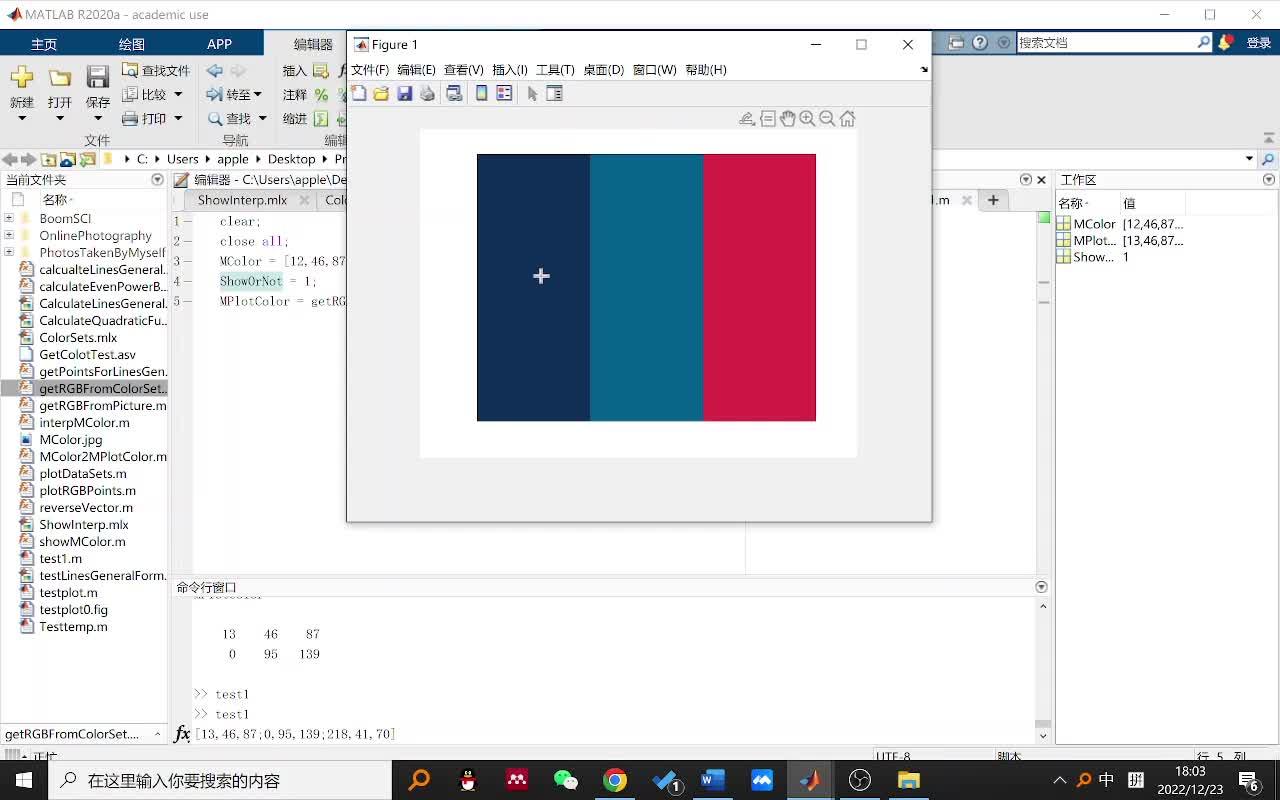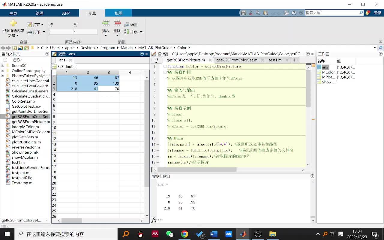 本文提供了一套基于MATLAB的色卡创建与管理的方案,并对方案所需的函数进行了介绍,包括getRGBFromPicture.m:从图片中提取多组RGB值形成色卡、interpMColor:利用渐变扩展色卡、getRGBFromColorSet.m:从已有色卡中提取部分颜色形成新色卡、showMColor.m:可视化色卡。