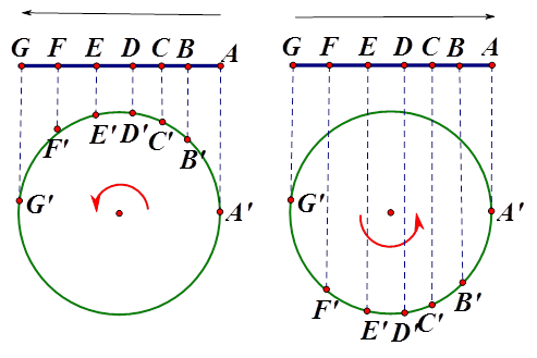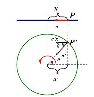 例如:一个质点1在A到G之间做简谐运动,而另一个质点2在它下方做逆时针的匀速圆周运动, 当质点1从右侧振幅点A运动到左侧振幅点G(上图左),然后又从G回到A(上图右),从而完成一次全振动时,质点2恰好也刚好从圆的右端A’开始逆时针完成了一次圆周运动。不仅如此,如果每时每刻质点1和2都在一条竖直线上。我们就称质点1的简谐运动是质点2匀速圆周运动的投影。