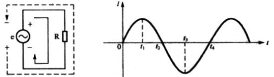 t4时刻以后,交流电源的电流大小和方向变化与0-t4期间变化相同。实际上,交流电源不但电流大小和方向按正弦波变化,其电压大小和方向变化也像电流一样按正弦波变化。