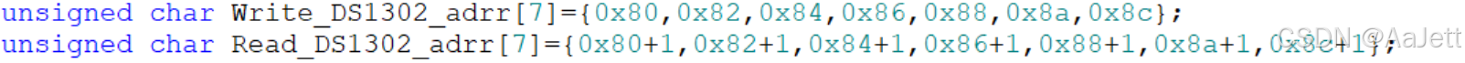 此时我们也知道我 从秒到年每一位的地址,于是我们可以把用数组把地址都装填到数组的每一位中,由下图可知,Write_DS1302_adrr数组是指写入的各个地址,Read_DS1302_adrr数组则是读出的各个地址。