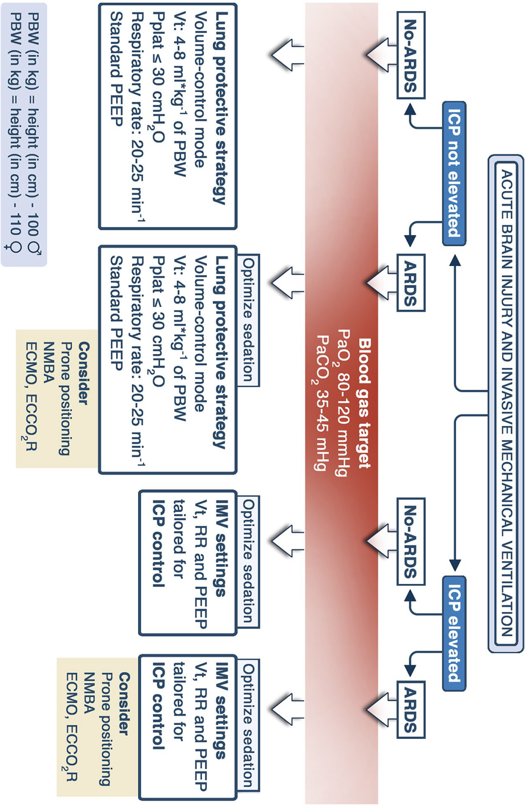 图.急性脑损伤患者的有创机械通气。第一步是使用容量辅助控制模式,将潮气量设置4-8ml/kg(PDW)范围内(图中提供了一个简化公式)。一种可能的选择是从6 ml/kg(PBW)开始,进一步调整Vt以保持Pplat≤30 cmH2O。保持PEEP至少5 cmH2O。FiO2设置的目标为PaO2达到80 mmHg至120 mmHg。目标PaCO2介于35至45 mmHg之间。ARDS-急性呼吸窘迫综合征、ECMO-体外膜肺氧合、ECCO2R-体外二氧化碳清除、ICP-颅内压、IMV-有创机械通气、PBW-预测体重、PEEP-呼气末正压、Pplat-平台压、NMBA-神经肌肉阻滞剂、RR-呼吸频率、Vt-潮气量:
