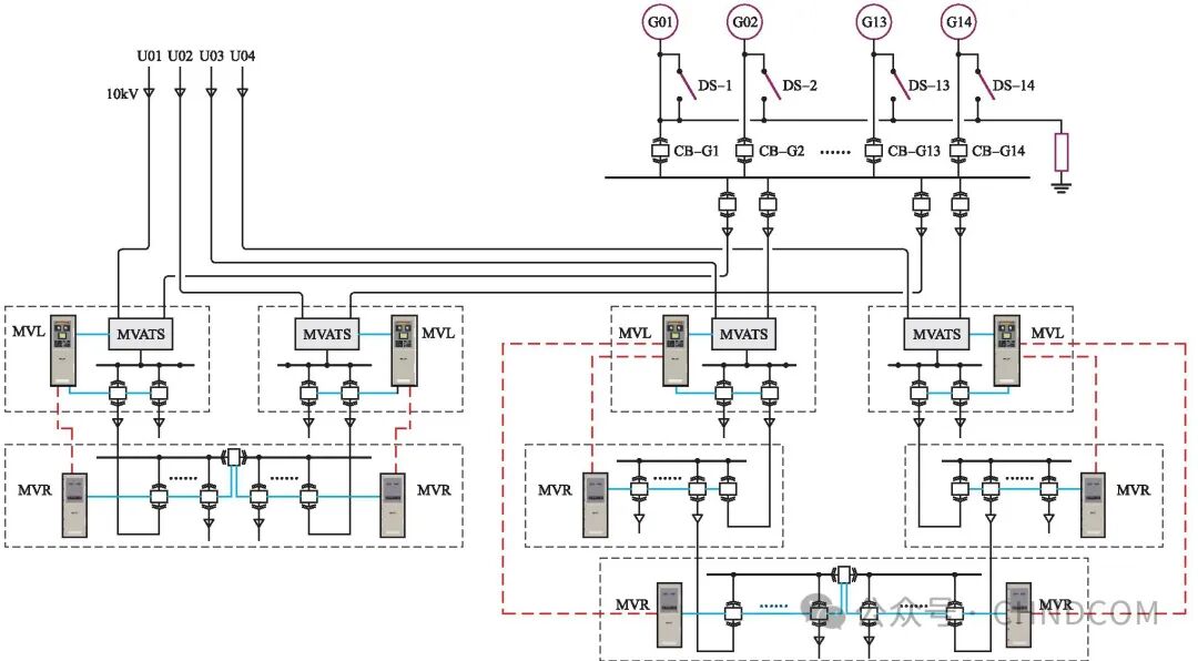 注:U——市电;G——柴油发电机组;DS——接地开关;CB——断路器;MVL——负荷逐级投切装置;MVATS——中压自动转换装置;MVR——逐级投切远程单元。
