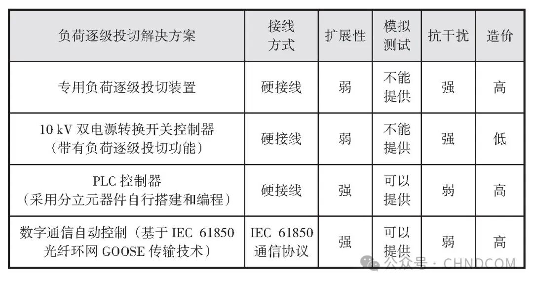 为满足上述负荷逐级投切的控制逻辑和动作原则,目前应用比较多的解决方案有:专用负荷逐级投切装置、10KV双电源转换开关控制器(带有负荷顺序投切功能)、PLC控制器(采用分立元器件自行搭建和编程)、数字通信自动控制(基于IEC 61850光纤环网GOOSE传输技术)[9]。下面针对以上几种解决方案进行介绍和比较分析,对于负荷逐级投切实现方案提出建议。