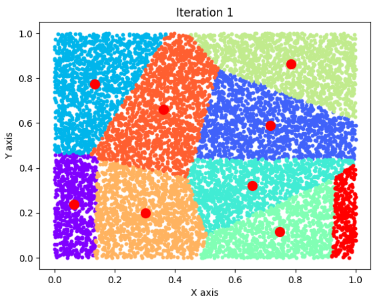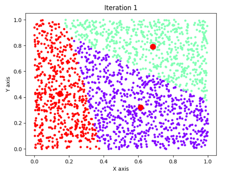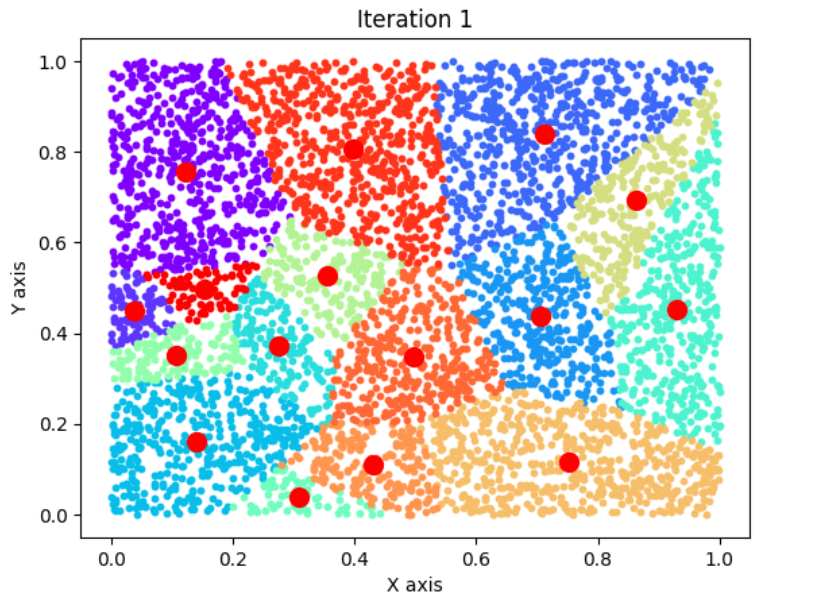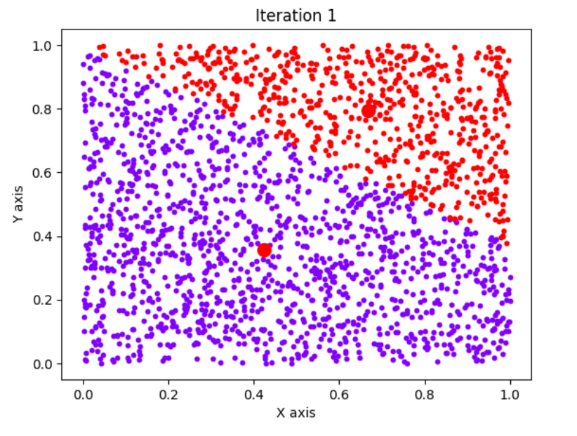# 4. 重复第2步和第3步,直到算法收敛,即中心点的位置与聚类的分配方案不再改变def kmeans(X, k, max_iters=100): centroids = initialize_centroids(X, k) for i in range(max_iters): labels = assign_clusters(X, centroids) new_centroids = update_centroids(X, labels, k) if np.all(centroids == new_centroids): break centroids = new_centroids plt.clf() # 清除当前图像 colors = cm.rainbow(np.linspace(0, 1, k)) # 生成k个颜色 for j in range(k): plt.scatter(X[labels == j, 0], X[labels == j, 1], s=10, c=colors[j]) plt.scatter(centroids[:, 0], centroids[:, 1], s=100, c=‘red’, marker=‘o’) plt.title(f’Iteration {i+1}‘) plt.xlabel(‘X axis’) plt.ylabel(‘Y axis’) plt.pause(5) # 每5秒更新一次图像 return centroids, labels