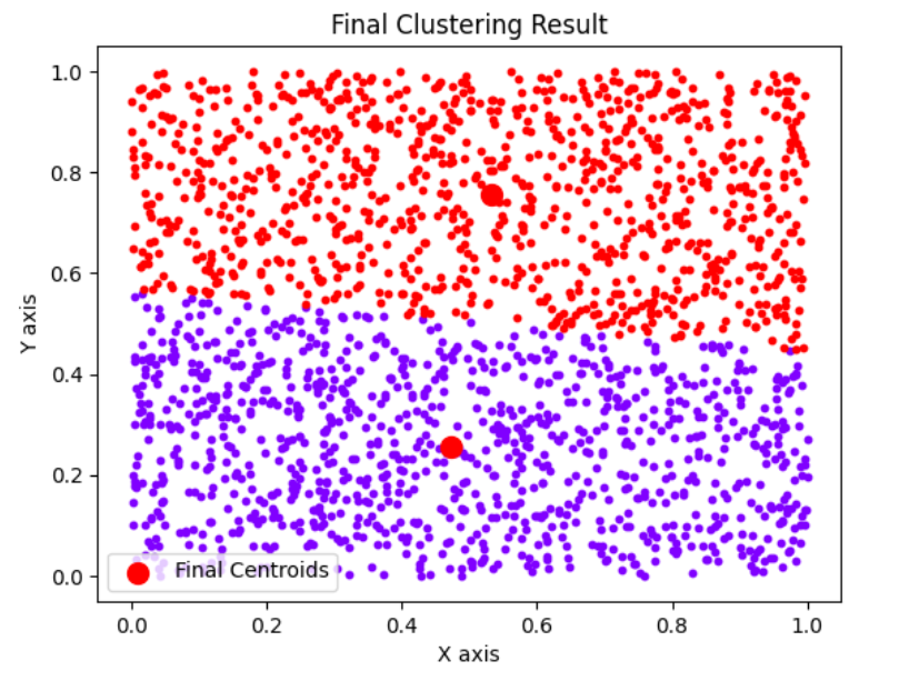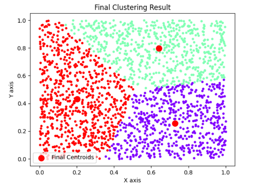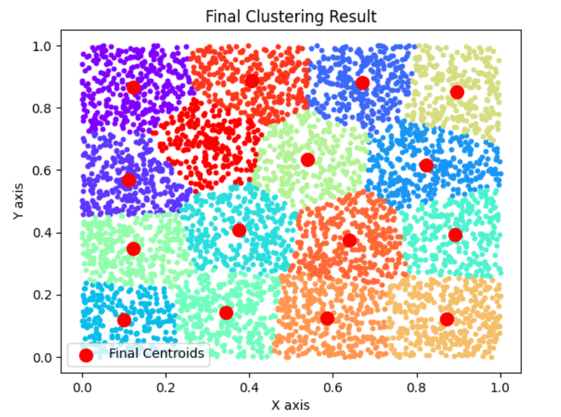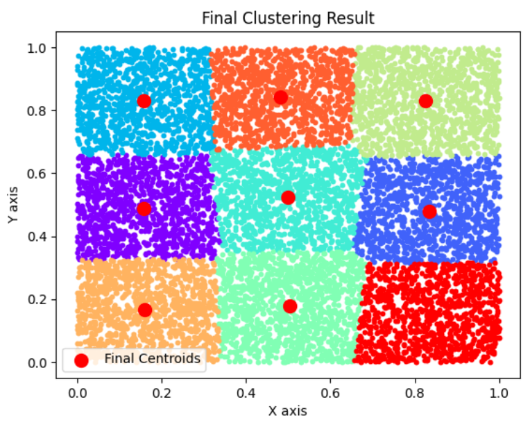 # 绘制最终的聚类结果colors = cm.rainbow(np.linspace(0, 1, k)) # 生成k个颜色for j in range(k): plt.scatter(X[labels == j, 0], X[labels == j, 1], s=10, c=colors[j])plt.scatter(centroids[:, 0], centroids[:, 1], s=100, c=‘red’, marker=‘o’, label=‘Final Centroids’)plt.title(‘Final Clustering Result’)plt.xlabel(‘X axis’)plt.ylabel(‘Y axis’)plt.legend()plt.show()