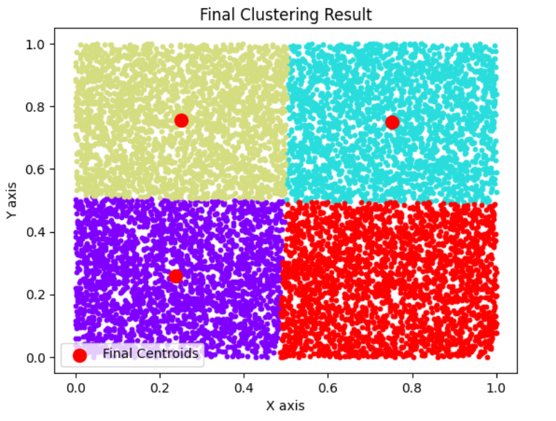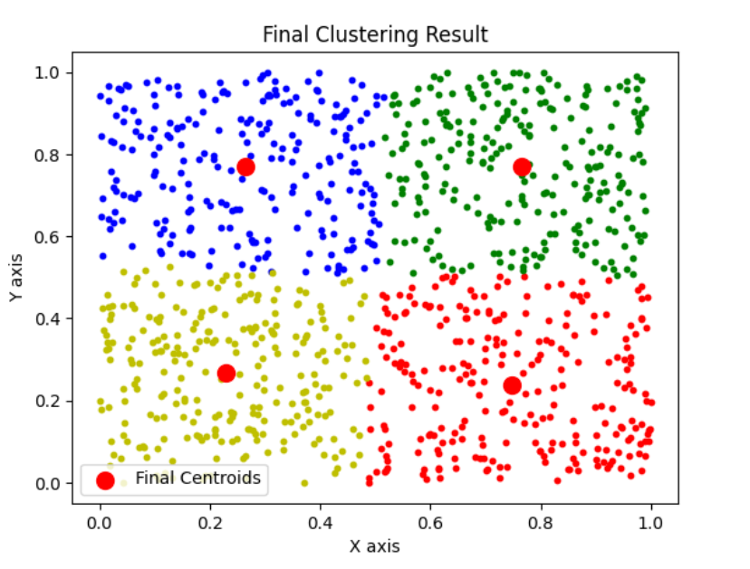 # 绘制最终的聚类结果colors = [‘r’, ‘b’, ‘y’, ‘g’]for j in range(k): plt.scatter(X[labels == j, 0], X[labels == j, 1], s=10, c=colors[j])plt.scatter(centroids[:, 0], centroids[:, 1], s=100, c=‘red’, marker=‘o’, label=‘Final Centroids’)plt.title(‘Final Clustering Result’)plt.xlabel(‘X axis’)plt.ylabel(‘Y axis’)plt.legend()plt.show()