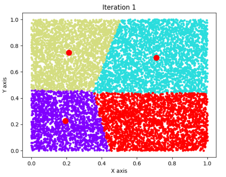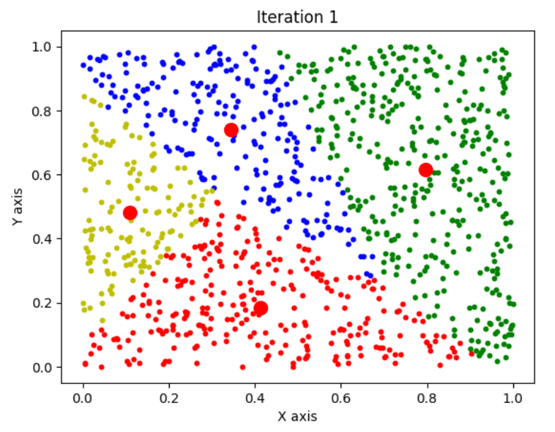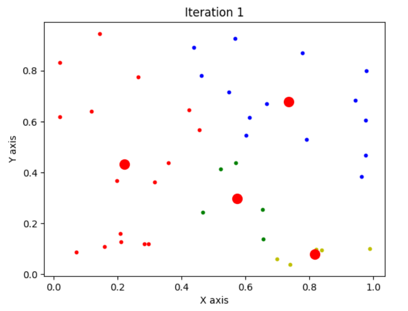 # 4. 重复第2步和第3步,直到算法收敛,即中心点的位置与聚类的分配方案不再改变def kmeans(X, k, max_iters=100): centroids = initialize_centroids(X, k) for i in range(max_iters): labels = assign_clusters(X, centroids) new_centroids = update_centroids(X, labels, k) if np.all(centroids == new_centroids): break centroids = new_centroids plt.clf() # 清除当前图像 colors = [‘r’, ‘b’, ‘y’, ‘g’] for j in range(k): plt.scatter(X[labels == j, 0], X[labels == j, 1], s=10, c=colors[j]) plt.scatter(centroids[:, 0], centroids[:, 1], s=100, c=‘red’, marker=‘o’) plt.title(f’Iteration {i+1}‘) plt.xlabel(‘X axis’) plt.ylabel(‘Y axis’) plt.pause(5) # 每5秒更新一次图像 return centroids, labels