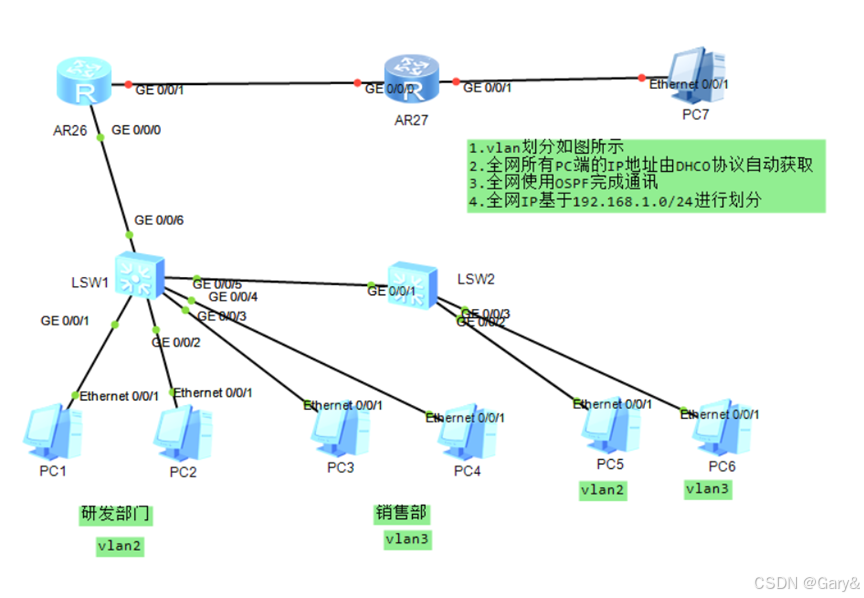 [sw1-GigabitEthernet0/0/1]port link-type access 定义该接口下链路类型为access链路