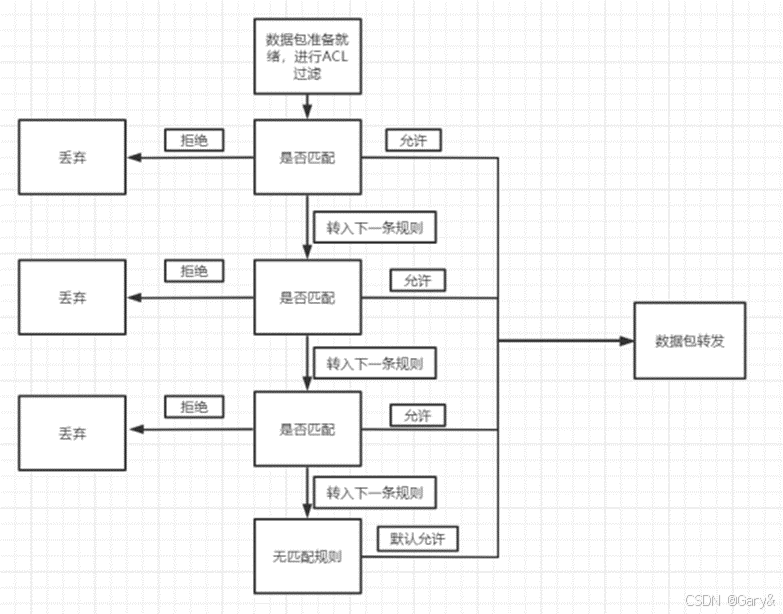 至上而下,逐一匹配,上调匹配按照上条执行,不在查看下条。在华为体系中末尾隐含允许所有,在思科体系中,末尾隐含拒绝所有。