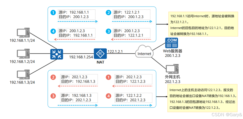 静态NAT和动态NAT最大的区别在于—地址映射表的内容是可变化的,而不是写死的,所以动态NAT不在意一对一的关系,而是实现多对多的转化。