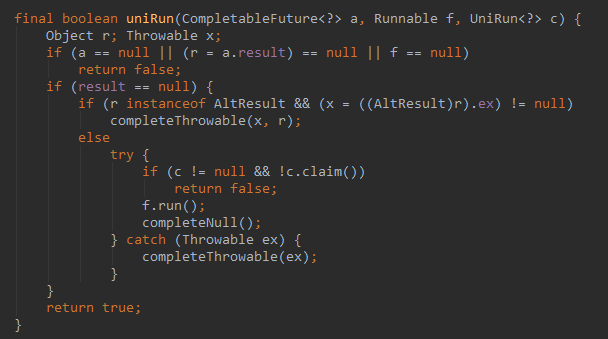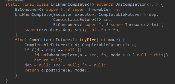 究其根本,其实是UniWhenCompletion和UniRun这两种不同的UniCompletion的实现导致的,我们再看下UniWhenCompletion的源码: