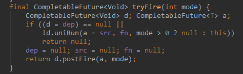 uniRun设置完异常值之后,返回了true,所以会走到最下面的d.postFire,所以在d上添加的响应可以被触发,那么这个d是什么呢?它就是在调用thenRun方法添加action时候创建的CompletableFuture,也是该方法的返回值,那么我们需要做的就是对这个d补充一个action: