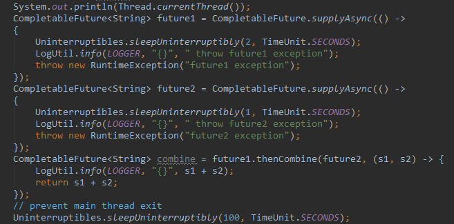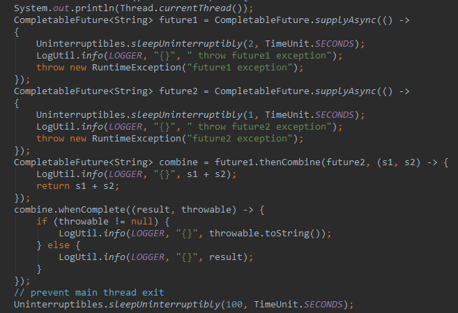 经过分析,我们知道combine.whenComplete的action触发的时候,两个future都已经执行完了,只不过第一个future(r)的异常结果设置完之后直接break掉了,所以这个whenComplete的参数throwable只是r的异常。那么我们可以在whenComplete方法中添加一些代码: