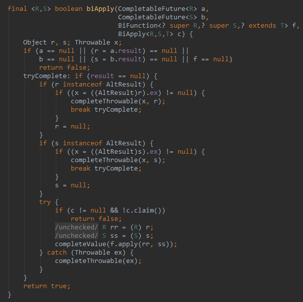 如图源码所示,这里当future1和future2都结束之后,会走到tryComplete块中,这里面第一个if判断,r是future1 exception,它是被包装成AltResult的异常,所以在第一个if块中直接就break掉,然后到最后返回true,所以这个action的apply方法没有机会被执行。这里面的r和s分别对应a和b的结果,a是future1,b是future2,所以永远都是future1的结果被设置到了当前的CompletableFuture中(这里我们起个名字较exception future,其实它就是调用thenCombine过程中创建的d)。