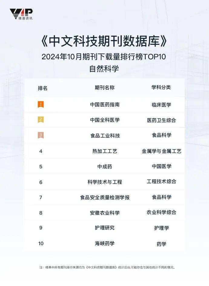 排行榜统计范围为已被维普《中文科技期刊数据库》全文收录,且被认定为具有一定学术价值的“自然科学类”期刊、集刊。榜单中所有期刊排行依据为《中文科技期刊数据库》统计后台全平台数据,学科分类参考自《中国图书馆分类法》。