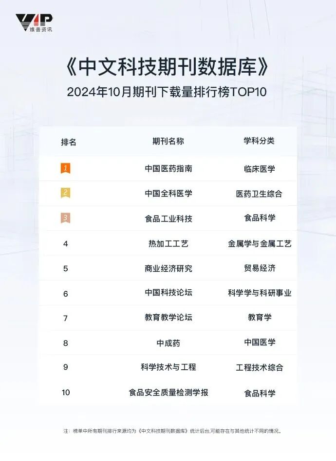 排行榜统计范围为已被维普《中文科技期刊数据库》全文收录,且被认定为具有一定学术价值的期刊、集刊。榜单中所有期刊排行依据为《中文科技期刊数据库》统计后台全平台数据,学科分类参考自《中国图书馆分类法》。