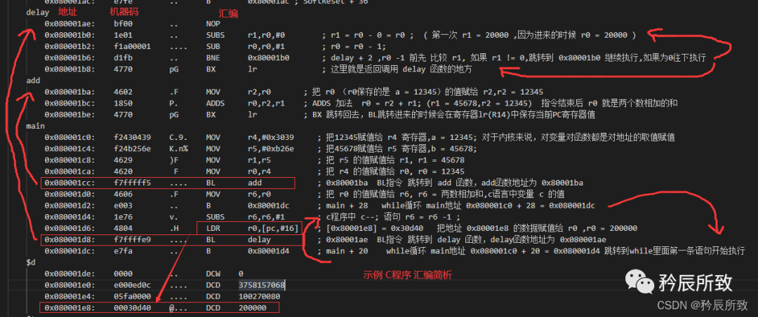 可以看到,因为存在函数的多次调用,main函数中调用add函数,add函数中调用delay函数,所以在add函数运行之前,通过 push 把 r4,r5,lr 寄存器的值先存入栈中,等待程序执行完(函数调用结束)再吧 r4,r5,lr 寄存器的值恢复。