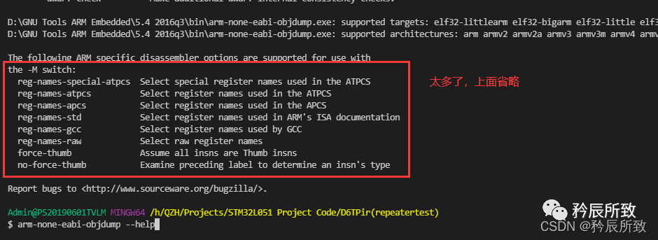 在网上有各种参考,但是我都测试过了,并没有找到合适的生成完全和标准汇编一致的那种,-M后面的参数也不能乱加,需要根据自己的交叉编译器,因为这里用的是 arm-none-eabi-gcc,所以可以通过arm-none-eabi-objdump –help 查看能用的命令和参数: