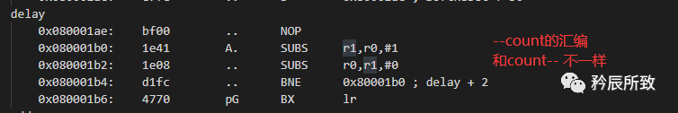添加一个有意思的测试对于delay函数中的语句,上图是while(count–);改成while(–count);后汇编代码如下: