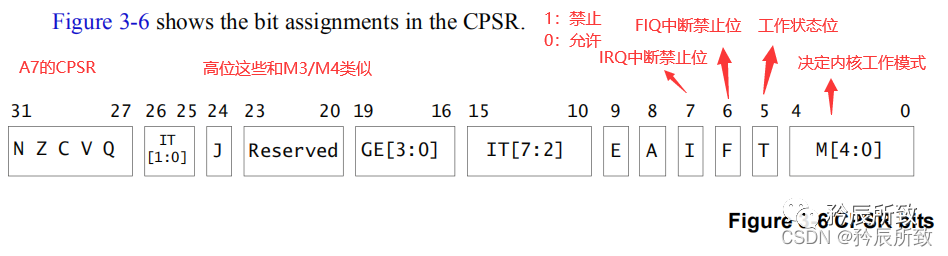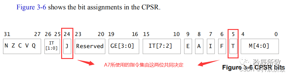 在A7中 CPSR中的:T(bit5) :控制指令执行状态,表明本指令是 ARM 指令还是 Thumb 指令,通常和 J(bit24)一起表明指令类型