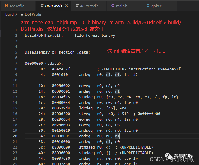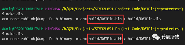 \((OBJDUMP) -D -b binary -m arm <span style="color:#0033FF;">(需要的elf文件,一般是工程名字)</span>.elf > <span style="color:#0033FF;">(改成你想生成的反汇编名字,一般是工程名字)</span>.dis # OBJDUMP = arm-none-eabi-objdump</p><p style="font-size: 16px;padding-top: 8px;padding-bottom: 8px;margin: 0;line-height: 26px;color: black;">-D表示对全部文件进行反汇编,-b表示二进制,-m表示指令集架构</p><p style="font-size: 16px;padding-top: 8px;padding-bottom: 8px;margin: 0;line-height: 26px;color: black;">Makefile修改如下:</p><pre style="margin-top: 10px;margin-bottom: 10px;border-radius: 5px;box-shadow: rgba(0, 0, 0, 0.55) 0px 2px 10px;"><span style="display: block;background: rgb(40, 44, 52) url("https://mmbiz.qpic.cn/mmbiz_svg/INk4JvWfe8XKT5PAJB9qLoMJFnYtfB6kUy9yEjjAGFegSrXGlibNc2mkFNW7WkQaViaWibJwdFdUJWwy6U8Db0XwImgp638JnQz/640?wx_fmt=svg") no-repeat scroll 10px 10px / 40px;height: 30px;width: 100%;margin-bottom: -7px;border-radius: 5px;"></span><code style="overflow-x: auto;padding: 16px;color: #abb2bf;display: -webkit-box;font-family: Operator Mono, Consolas, Monaco, Menlo, monospace;font-size: 12px;-webkit-overflow-scrolling: touch;padding-top: 15px;background: #282c34;border-radius: 5px;">...<br />TARGET = D6TPir<br /><span style="color: #5c6370;font-style: italic;line-height: 26px;"></span><br /><span style="color: #5c6370;font-style: italic;line-height: 26px;"># paths</span><br /><span style="color: #5c6370;font-style: italic;line-height: 26px;"></span><br /><span style="color: #5c6370;font-style: italic;line-height: 26px;"># Build path</span><br />BUILD_DIR = build<br />...<br />PREFIX = arm-none-eabi-<br />...<br />OBJDUMP = \)(PREFIX)objdump