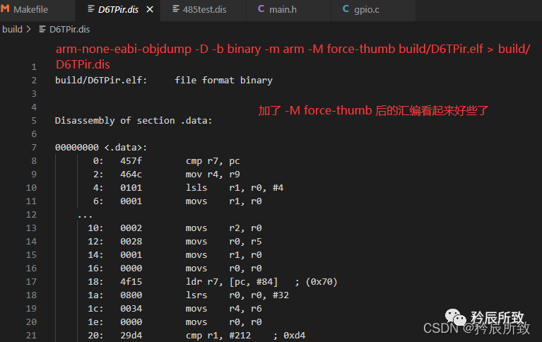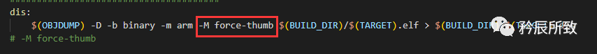 \((OBJDUMP) -D -b binary -m arm \)(BUILD_DIR)/\((TARGET).elf > \)(BUILD_DIR)/\((TARGET).dis<br /><span style="color: #5c6370;font-style: italic;line-height: 26px;"># \)(OBJDUMP) -D -b binary -m arm \((BUILD_DIR)/\)(TARGET).bin > \((BUILD_DIR)/\)(TARGET).dis