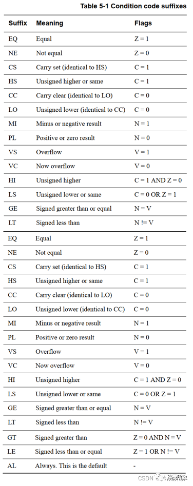 MOV EQ R0,R1 ;加上EQ,如果上面R0的值和R2的值相等的话,才执行此语句