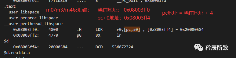 下面是一个 STM32F103 反汇编程序,找了一段有[pc,#0]的代码,方便判断: