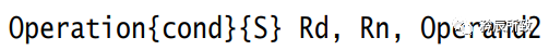 表示各类汇编指令,比如 ADD、MOV;cond表示conditon,即该指令执行的条件,如 EQ,NE 等;S表示该指令执行后,是否会影响CPSR寄存器的值, 是否影响CPSR 寄存器的值,书写时影响CPSR,否则不影响;Rd