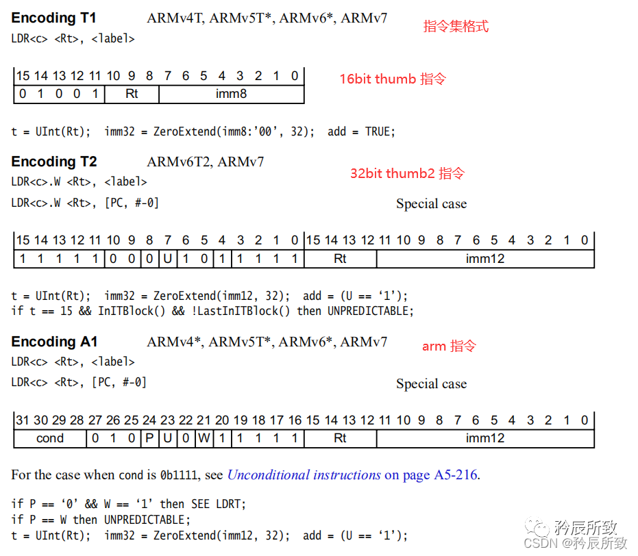 不同指令集的编码格式(以 LDR 为例),摘自《ARM ArchitectureReference Manual ARMv7-A and ARMv7-R edition》: