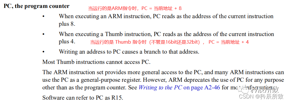 同时已经在读取下下一条指令:PC = A +4 (Thumb/Thumb2指令集)、PC = A + 8 (ARM指令集)
