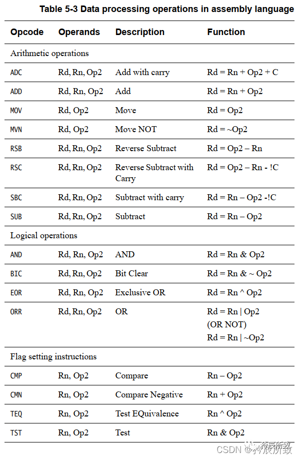对于“数据处理”处理指令中的Operation ,指令集如下: