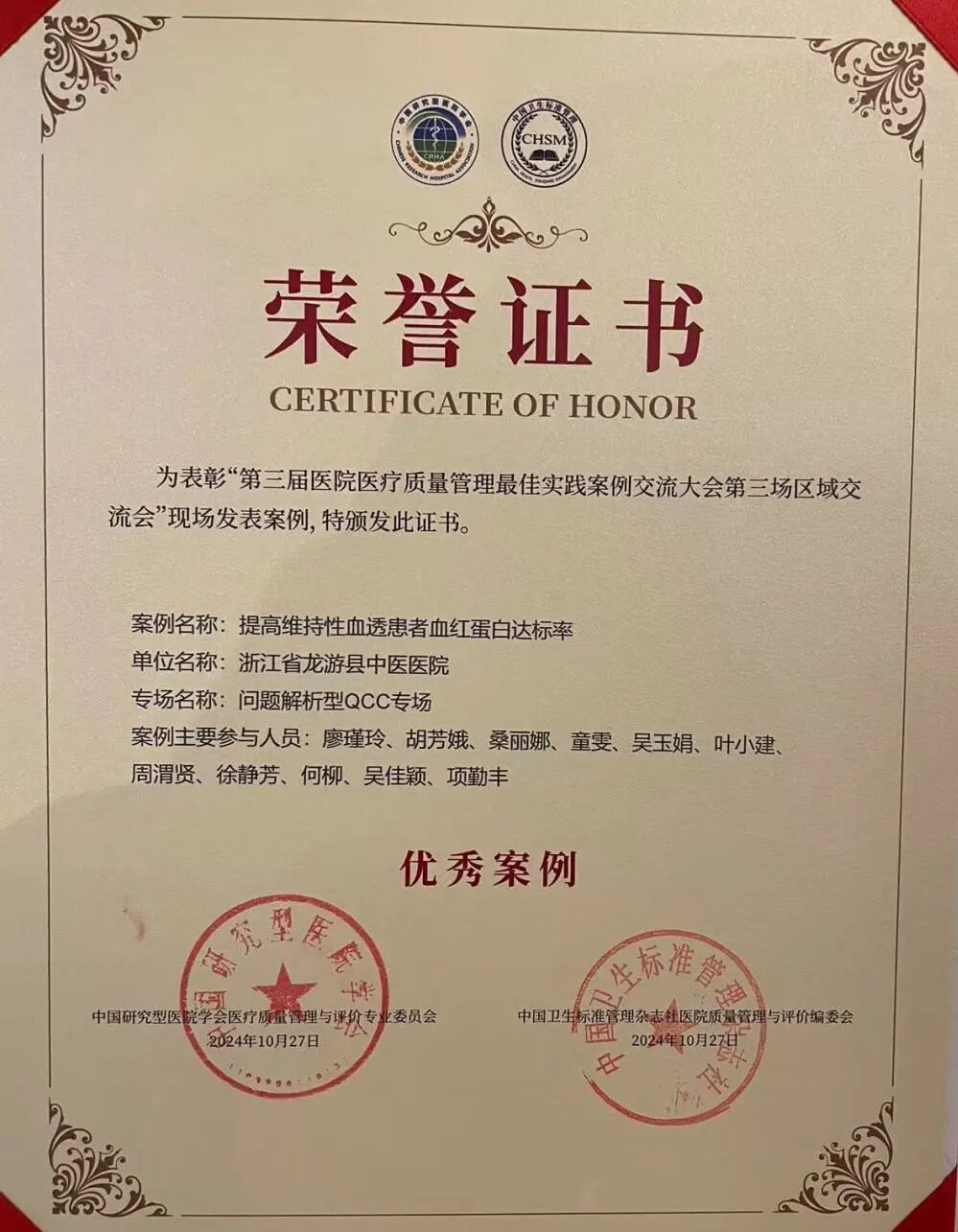 10月25日~27日,在由中国研究型医院学会医疗质量管理与评价专委会和中国卫生标准管理杂志社医院质量管理与评价编委会联合主办的“第三届医院医疗质量管理**实践案例交流大会”第三场区域预选交流会上,在问题解析型QCC专场中,县中医院选送的《提高维持性血透患者血红蛋白达标率》进行现场汇报交流。经现场评审,被评选为优秀案例。