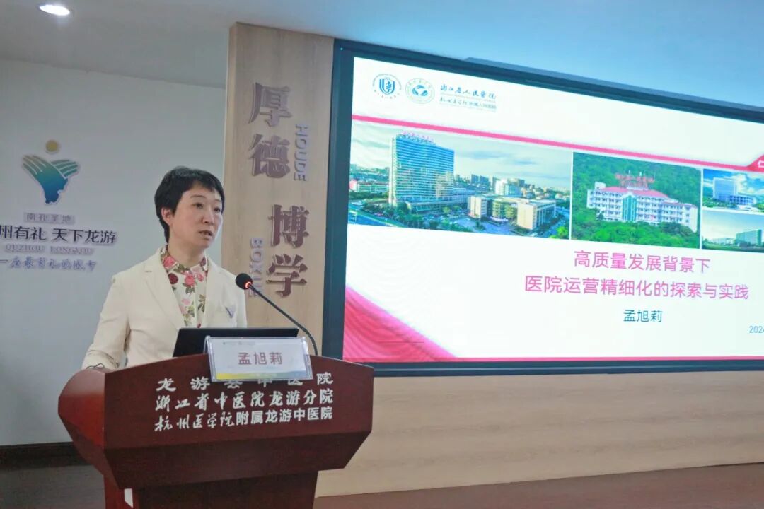10月25日,龙游县中医院“2024年院庆学术月”第二场活动在四楼会议室举行,全体中层干部参加。活动特邀浙江省人民医院党委副书记、副院长孟旭莉作《高质量发展背景下医院运营精细化的探索与实践》。孟旭莉教授围绕政策背景、精细化的成本管控、多维绩效考核管理及成效等方面,强调了高质量发展背景下医院探索新型发展道路的必要性,提出要以提质增效为导向开展精细化管理,通过成本管控和绩效管理推动医院可持续发展。