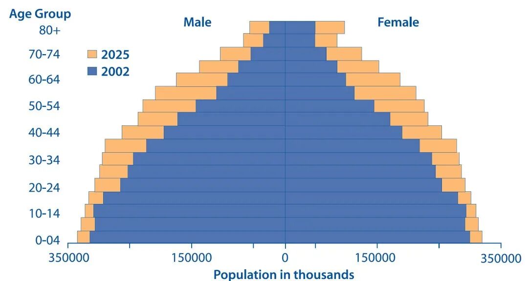 * 据世界卫生组织(WHO)统计的2002与2025年人口年龄分布金字塔。 老年人的占比将会在未来的几十年内持续增加。