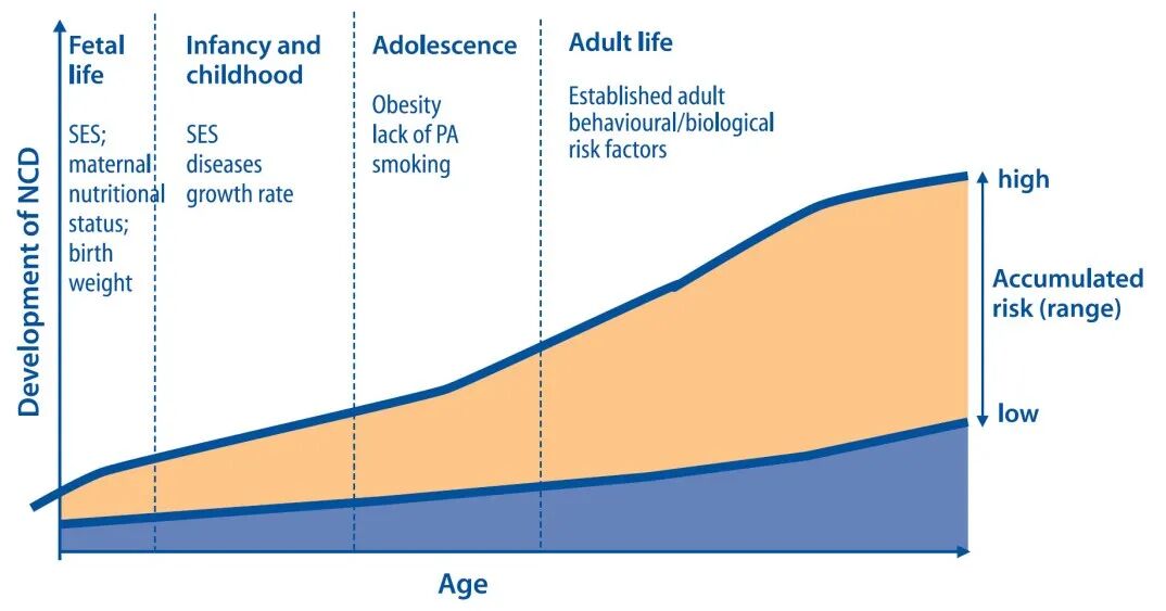 * WHO 构建的模型,当人的年龄增长时,他患上非传染性疾病的概率不断累积、提升,成为高风险人群(黄色部分)。然而,如果有有效的预防措施,风险仅仅是蓝色部分。