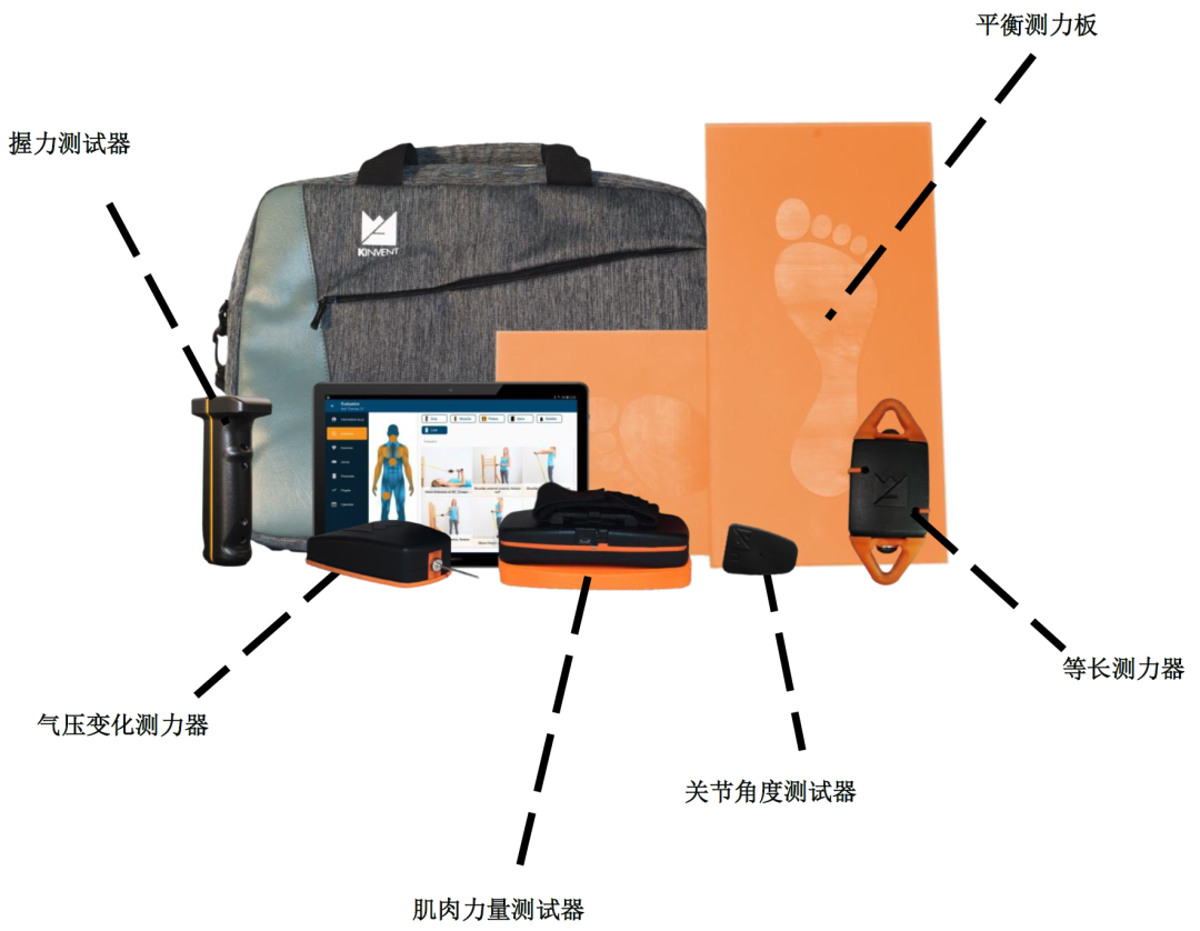 产品包含 1 个智能移动用户端 APP 和 6 个 KFORCE 康复器材(6个KFORCE传感器:握力测试器,肌肉力量测试器,平衡测力板,关节角度测试器,气压变化测力器,等长测力器)。