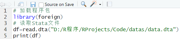 下面使用read.dta()函数读取“data.dtaStata文件,运行RStudio,编写如下代码: