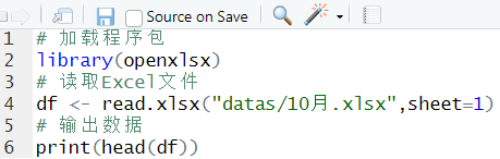 下面使用openxlsx包读取“10.xlsx”文件,运行RStudio,编写如下代码: