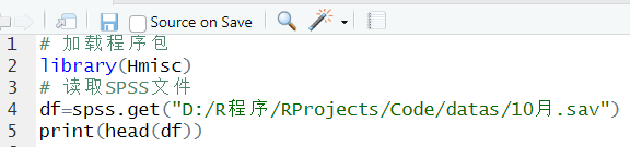 下面使用spss.get()函数读取“10.sav”SPSS文件,运行RStudio,编写如下代码: