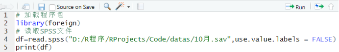 下面使用read.spss()函数读取“10.savSPSS文件,运行RStudio,编写如下代码: