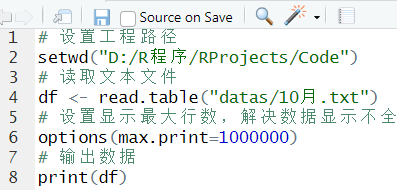 代码解析: setwd()函数用于更改工程目录,但是它不会自动创建一个不存在的目录。当读取文本文件数据量较多时,在R控制台输出数据会出现显示不全的问题,此时使用options()函数设置最大行数,数据就可以全部显示。 /o:p