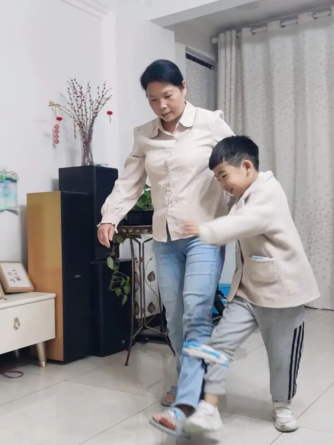 我和妈妈玩两人三足的时候,妈妈都能把我整个人都抬起来啦!